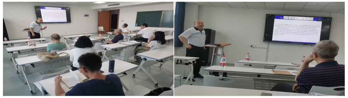 “学术报告”阶段,卢玉峰教授作了题目为“The Structure of compressed shift operators and generalized Cowen-Douglas operator”的报告(线上线下同时进行)。报告中,卢教授所讲解的Hardy空间上压缩移位算子的可约性以及与之相关的广义Cowen-Douglas算子等相关问题是基础数学中算子理论领域国际前沿问题。卢教授的报告拓宽了我们的科研视野,为未来的科学研究提供新的思想方法。